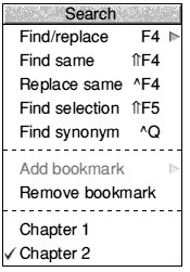 Bookmarks are a convenient way of marking, by name, a position in the document. This name is included in the Search menu - choosing it returns the caret to that part of the document.