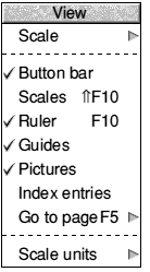 View menuThe View menu contains commands that let you alter the scaling of a document, show or hide rulers, scales and pictures and go to a specific page in the document.