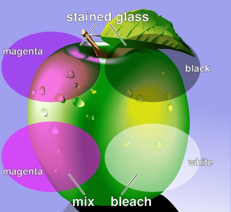 of viewing the underlying objects through stained glass (subtractive colour mix). Bleach simulates