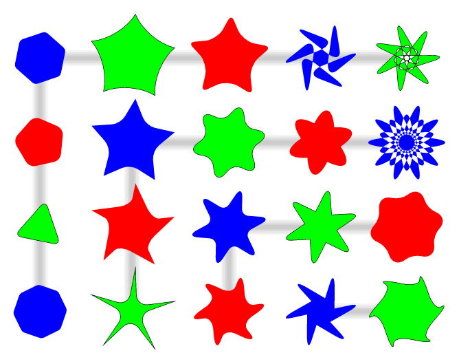 change radius, number of sides, angle, turn polygons into stars and vice versa,